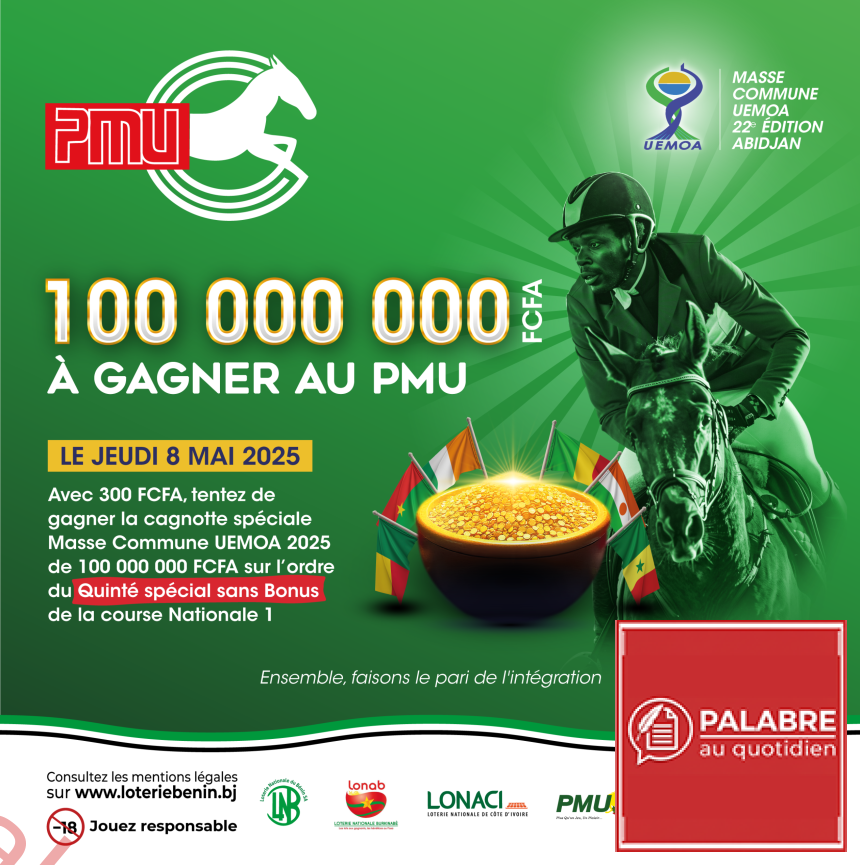 Ce jeudi 8 mai 2025, Abidjan, e Côte d’Ivoire sera la capitale d’un événement exceptionnel. Il s’agit de la 22ᵉ édition de la Masse Commune UEMOA qui s’annonce plus palpitante que jamais, pour tous les amateurs de paris et de sensations fortes. C’est l’occasion rêvée de tenter votre chance et de remporter une incroyable cagnotte spéciale de 100 000 000 FCFA au PMU.