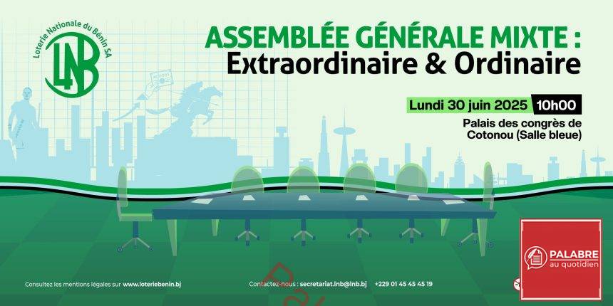 Suite à son entrée remarquée sur le marché financier, la Loterie Nationale du Bénin S.A. (LNB S.A.) convie ses actionnaires à une assemblée générale mixte (Extraordinaire et ordinaire ) le lundi 30 juin prochain. Cette rencontre marquera une nouvelle étape importante dans la vie de l’entreprise, désormais cotée en bourse.