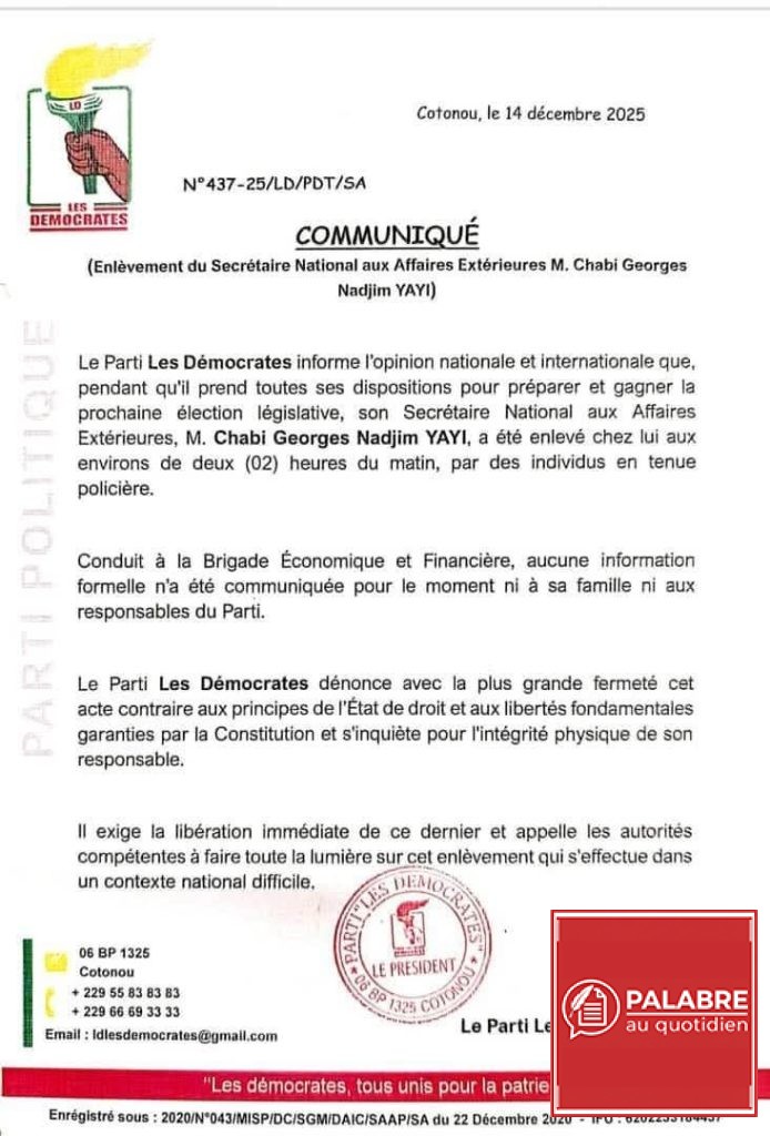 Face à cette situation, Les Démocrates exigent la libération immédiate et sans condition de Chabi Yayi, rappelant que nul ne peut être privé de sa liberté sans que la loi ne l’y autorise clairement. Le communiqué appelle en outre la communauté nationale et internationale à veiller au respect des droits fondamentaux et des principes démocratiques, soulignant que la sécurisation de l’environnement politique passe par le respect des libertés civiques et la transparence des procédures judiciaires.