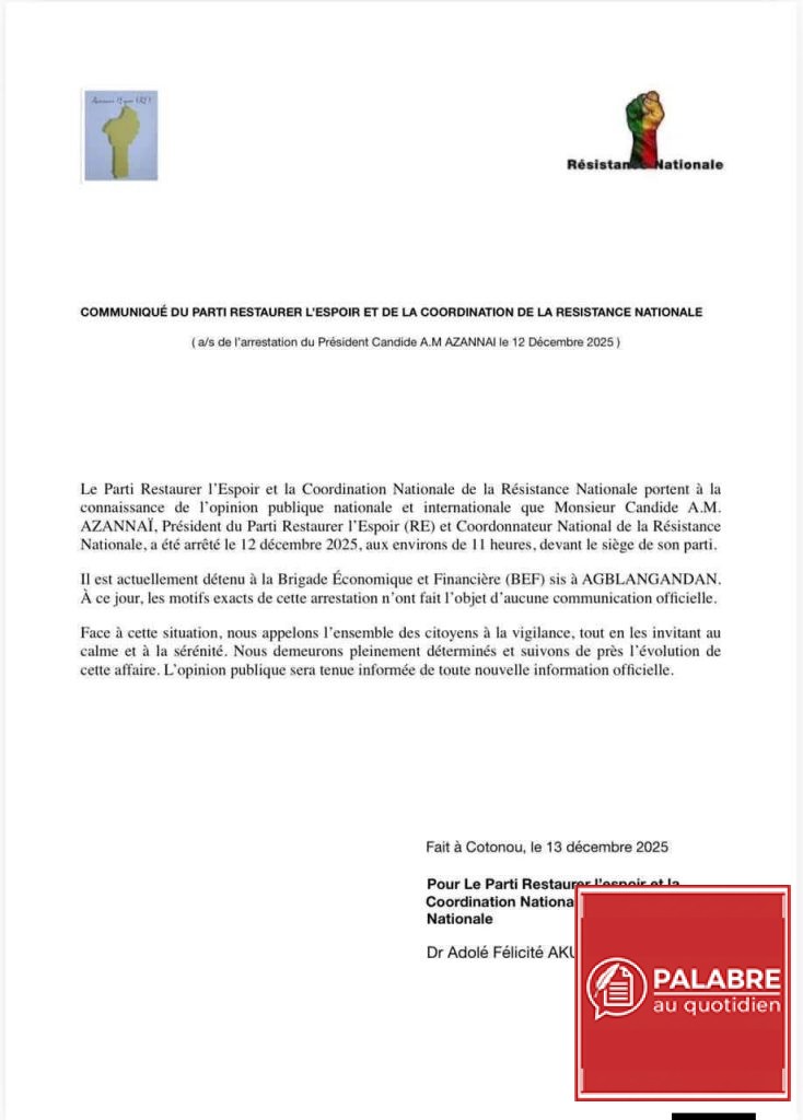 ILe Parti Restaurer l’Espoir (RE) et la Coordination nationale de la Résistance nationale ont rendu public un communiqué relatif à l’arrestation de leur président, Monsieur Candide A. M. AZANNAÏ, intervenue le vendredi 12 décembre 2025 à Cotonou.