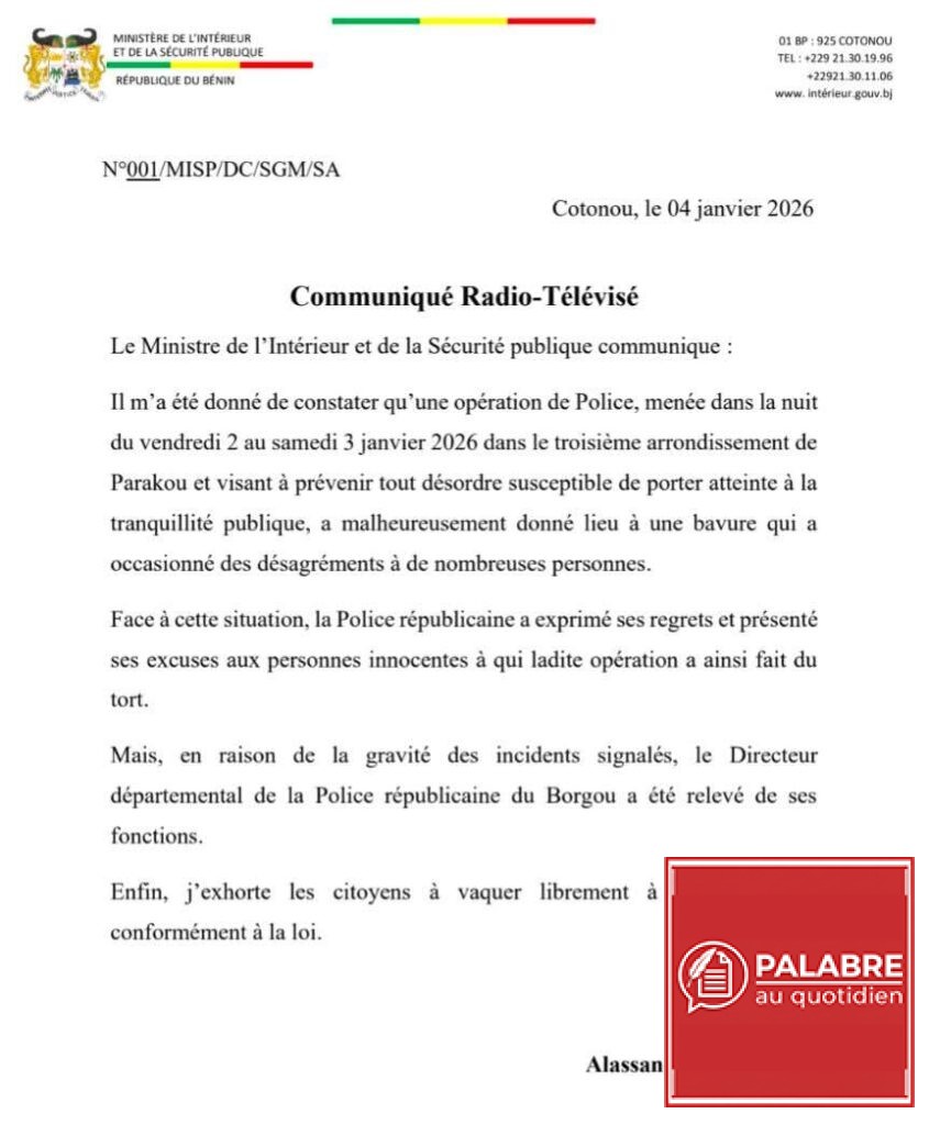Le Ministre de l’Intérieur et de la Sécurité publique a rendu public un communiqué relatif à l’opération de police menée dans la nuit du vendredi 2 au samedi 3 janvier 2026 dans le troisième arrondissement de Parakou, une intervention qui, selon les autorités, visait à prévenir tout désordre susceptible de troubler la tranquillité publique.