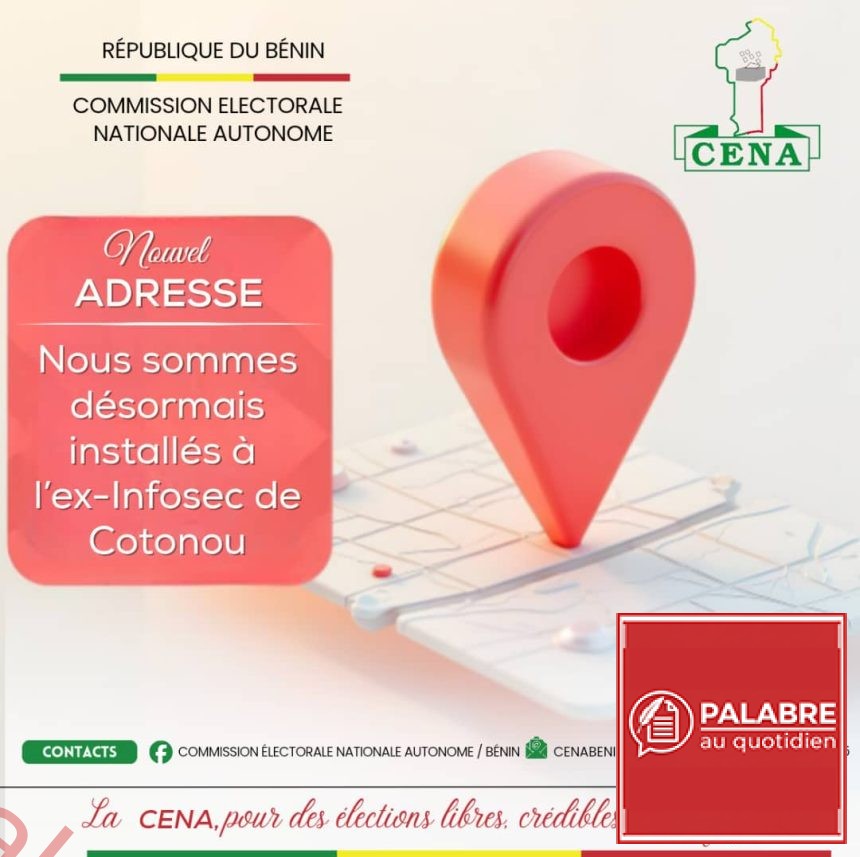 Le site qu’elle occupait jusqu’à présent — à Ganhi/Ex-INSAE — étant concerné par les projets d’aménagement, la CENA s’installe désormais dans les locaux de l’ancien Institut de Formation Sociale, Économique et Civique (INFOSEC), à proximité du Ministère des Affaires Étrangères, de la Société de Radiodiffusion et Télévision du Bénin (SRTB) et d’autres institutions gouvernementales.