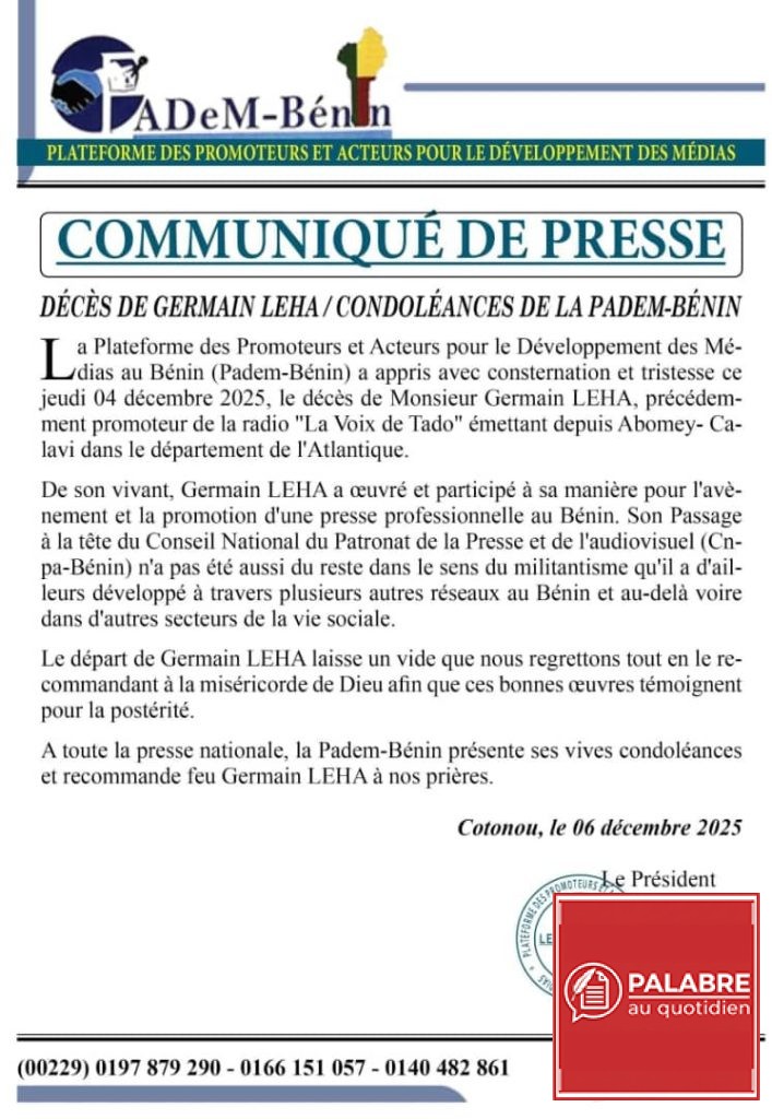 Dans un message empreint d’émotion et de solidarité, la PADEM-Bénin a présenté ses sincères condoléances à la famille du défunt, à ses proches ainsi qu’à l’ensemble des professionnels des médias touchés par cette disparition brutale.