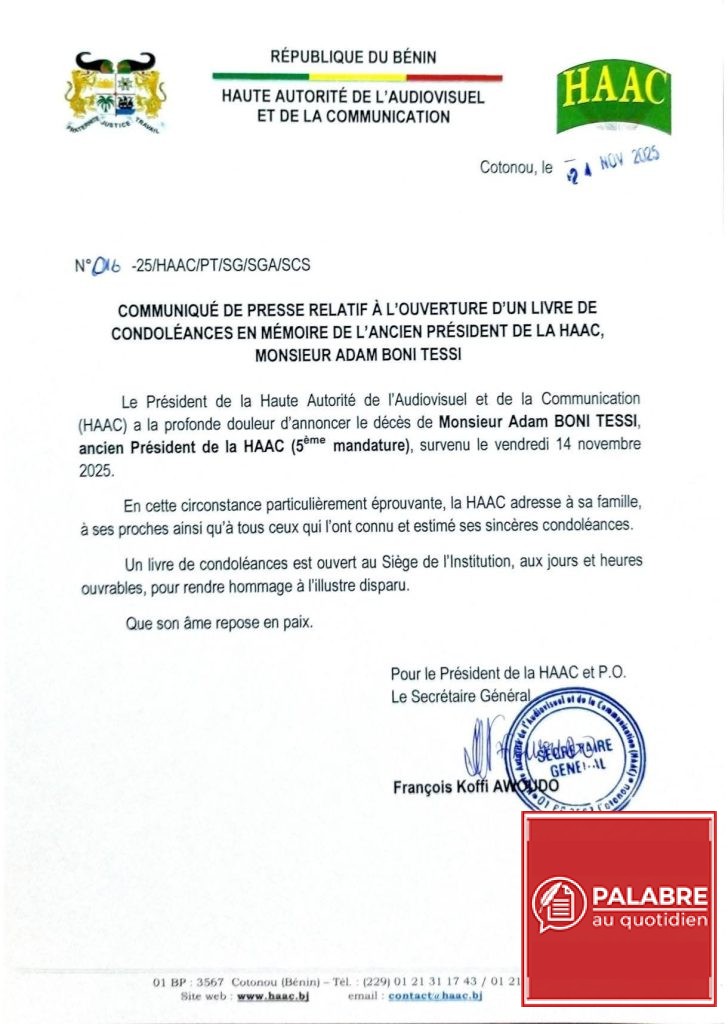 La Haute Autorité de l’Audiovisuel et de la Communication (HAAC) du Bénin poursuit les hommages à l’endroit de M. Adam Boni TESSI, ancien Président de l’institution et figure marquante de la cinquième mandature, dont le décès a été annoncé le vendredi 14 novembre 2025. Dans un communiqué officiel référencé N°016-25/HAAC et daté du 24 novembre 2025, l’institution de régulation des médias au Bénin informe l’opinion publique de l’ouverture d’un livre de condoléances en mémoire de celui qui fut l’un des piliers de la régulation des médias au Bénin.
