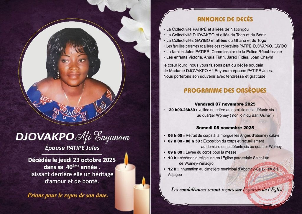 La levée du corps, suivie de l’inhumation, aura lieu ce samedi 8 novembre 2025 au cimetière municipal d’Abomey-Calavi, sis à Adjabo. Parents, amis, collègues et connaissances sont invités à se joindre à la famille pour lui rendre un dernier hommage et partager leur compassion en ces instants de grande douleur.