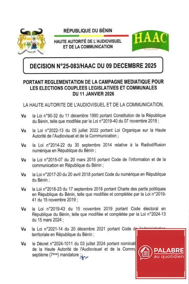 La Haute Autorité de l’Audiovisuel et de la Communication (HAAC) du Bénin poursuit méthodiquement sa mission constitutionnelle dans le cadre du processus électoral devant conduire aux élections couplées législatives et communales du 11 janvier 2026. La 7ᵉ mandature vient de franchir une nouvelle étape décisive en réunissant, ce mercredi 10 décembre 2025 à Cotonou, les représentants des partis politiques en lice ainsi que les responsables des médias de service public.