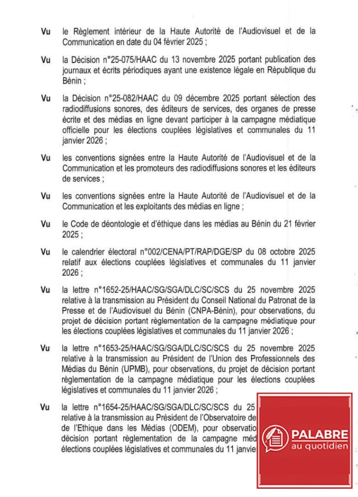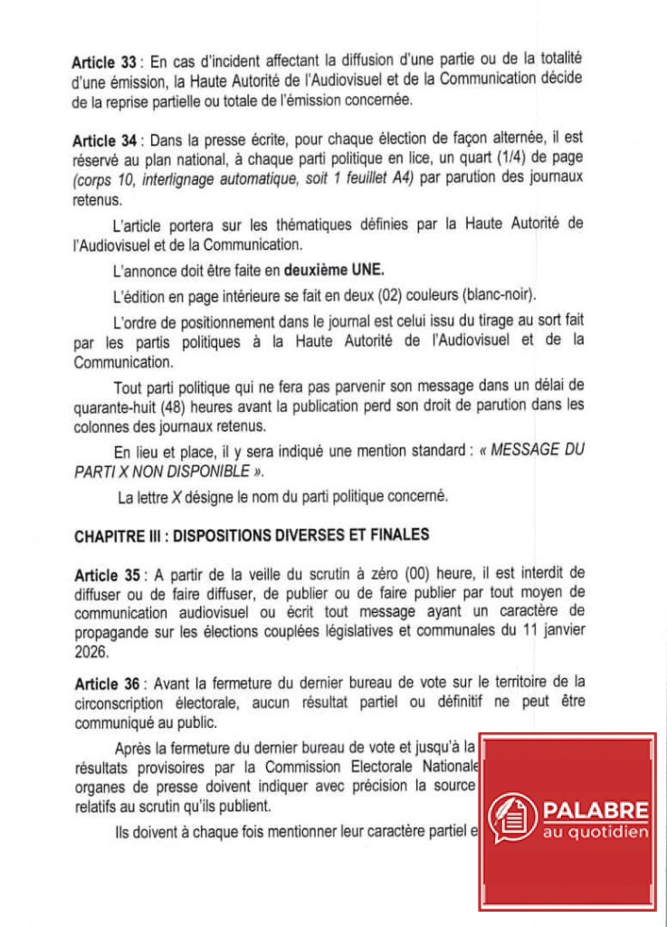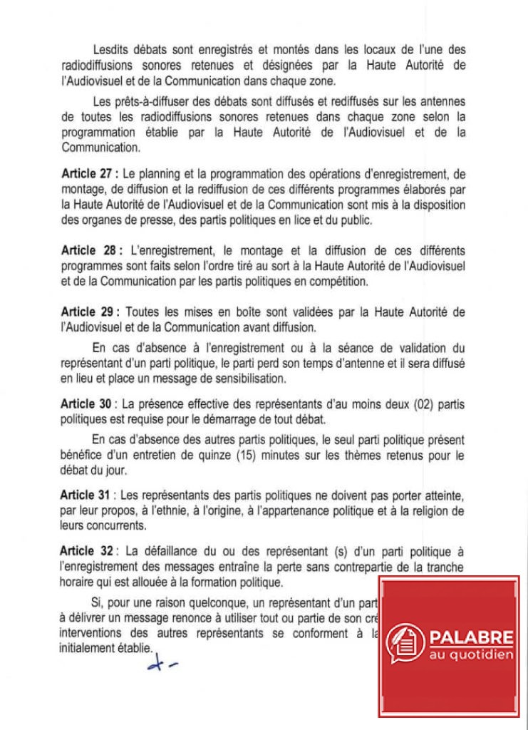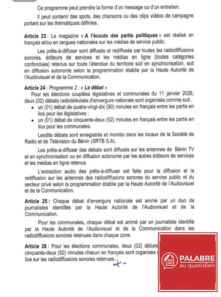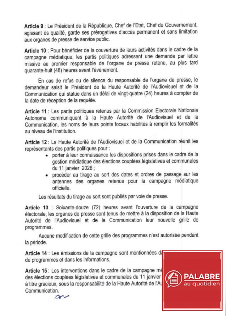 La Décision N°25-083/HAAC du 09 décembre 2025, forte de 40 articles, a été présentée aux participants. Elle fixe les règles d’accès des partis aux médias publics et encadre leur visibilité dans les médias privés pendant la période officielle de campagne. Celle-ci s’ouvrira le 26 décembre 2025 à 00h pour s’achever le vendredi 09 janvier 2026 à minuit.