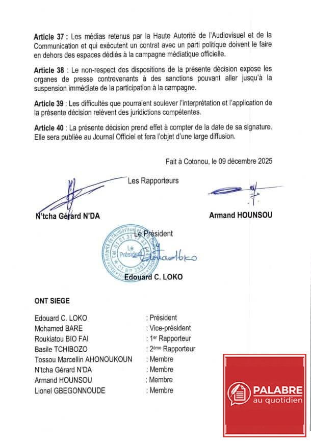 Avant la lecture de la décision par le 1ᵉʳ rapporteur, Roukiatou BIO FAÏ, le Président Édouard LOKO a tenu à rappeler la détermination de la HAAC à garantir une campagne médiatique « sérieuse, équilibrée et efficace ». L’institution, affirme-t-il, a pris toutes les dispositions nécessaires pour assurer l’égalité de traitement dans les médias de service public et l’équité au sein des médias privés. Il a toutefois invité les partis politiques à « jouer pleinement leur rôle » afin que la campagne soit une « belle fête médiatique » au service de la démocratie.