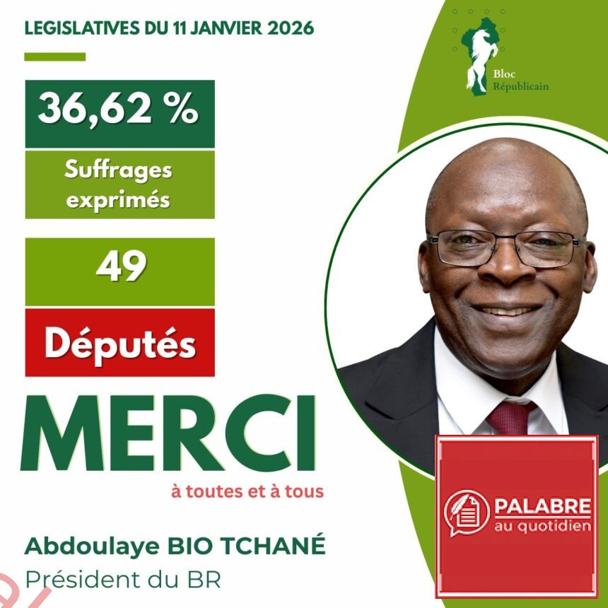 La Cour constitutionnelle a définitivement scellé, ce lundi 19 janvier 2026, les résultats des élections législatives du 11 janvier dernier. À l’issue de ce processus électoral, le Bloc Républicain (BR) enregistre un score significatif de 36,62 % des suffrages exprimés, lui permettant d’obtenir 49 sièges sur les 109 que compte l’Assemblée nationale, dont 41 sièges ordinaires et 8 sièges réservés aux femmes.