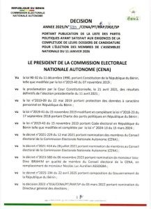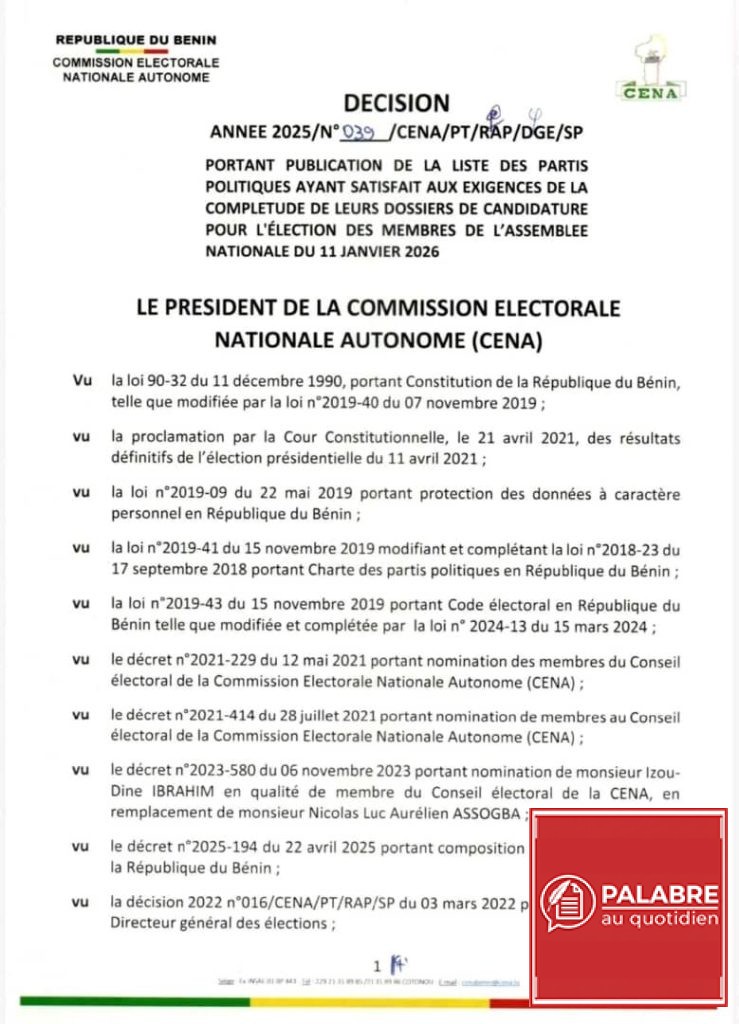La Céna a en effet validé les dossiers des partis UP Le Renouveau, Bloc Républicain, FCBE, Les Démocrates et MOELE-Bénin. Ces formations pourront donc concourir pour le renouvellement de l’Assemblée nationale à l’issue du scrutin législatif.