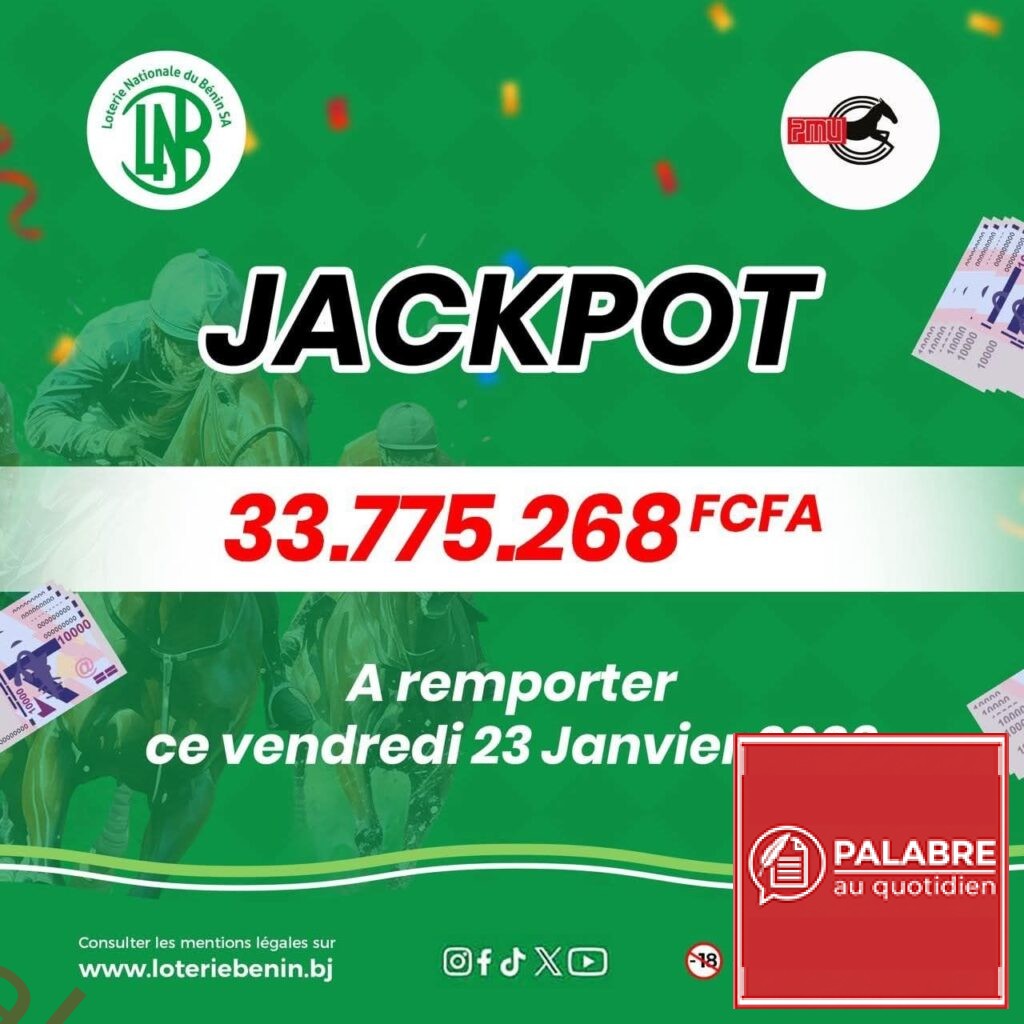 La chance pourrait frapper fort ce vendredi 23 janvier 2026 au PMU de la Loterie Nationale du Bénin (LNB S.A.). À l’occasion du Quinté+, un jackpot exceptionnel de 33 775 268 francs CFA est mis en jeu, offrant aux parieurs une opportunité unique de décrocher le gros lot avec une mise minimale de 300 FCFA.