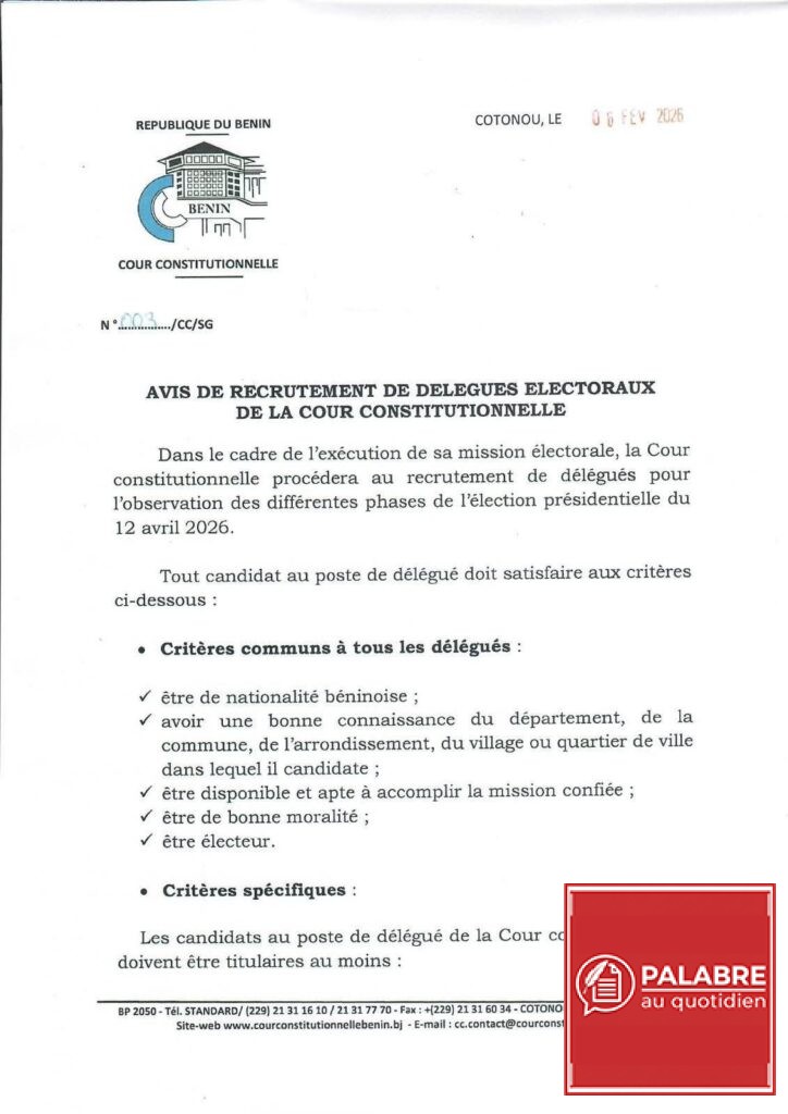 Dans la perspective de l’élection présidentielle du 12 avril prochain, la Cour Constitutionnelle du Bénin lance un appel à candidatures pour le recrutement de ses délégués, chargés d’assurer l’observation et le suivi des différentes étapes du scrutin sur l’ensemble du territoire national.