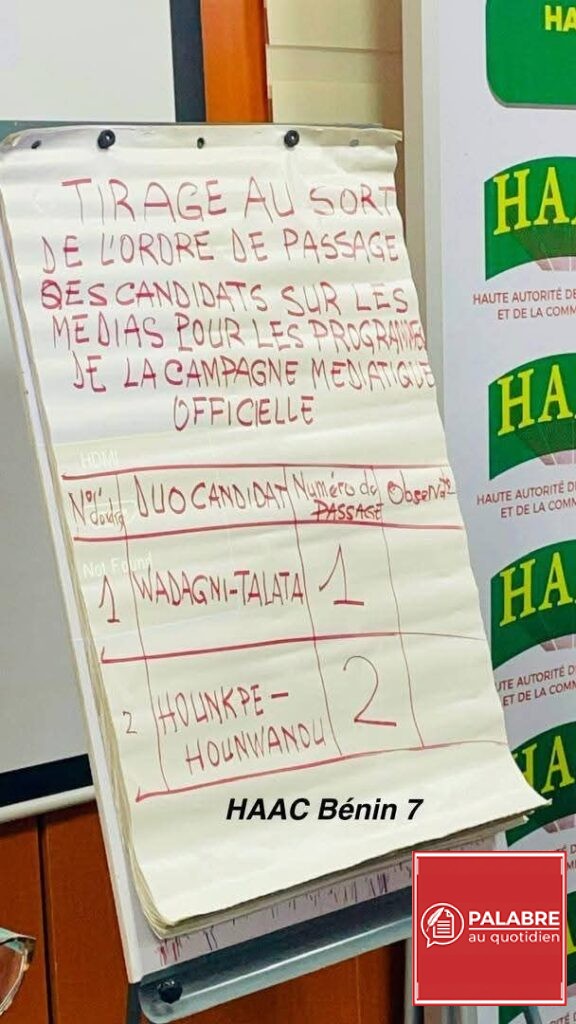 Face à l’absence prolongée du représentant du duo candidat Paul Hounkpè – Rock Hounwanou, le président de la HAAC a ordonné que la procédure se poursuive conformément aux règles établies. Le tirage au sort s’est ainsi déroulé en présence des conseillers de l’institution, des cadres administratifs ainsi que de professionnels des médias.