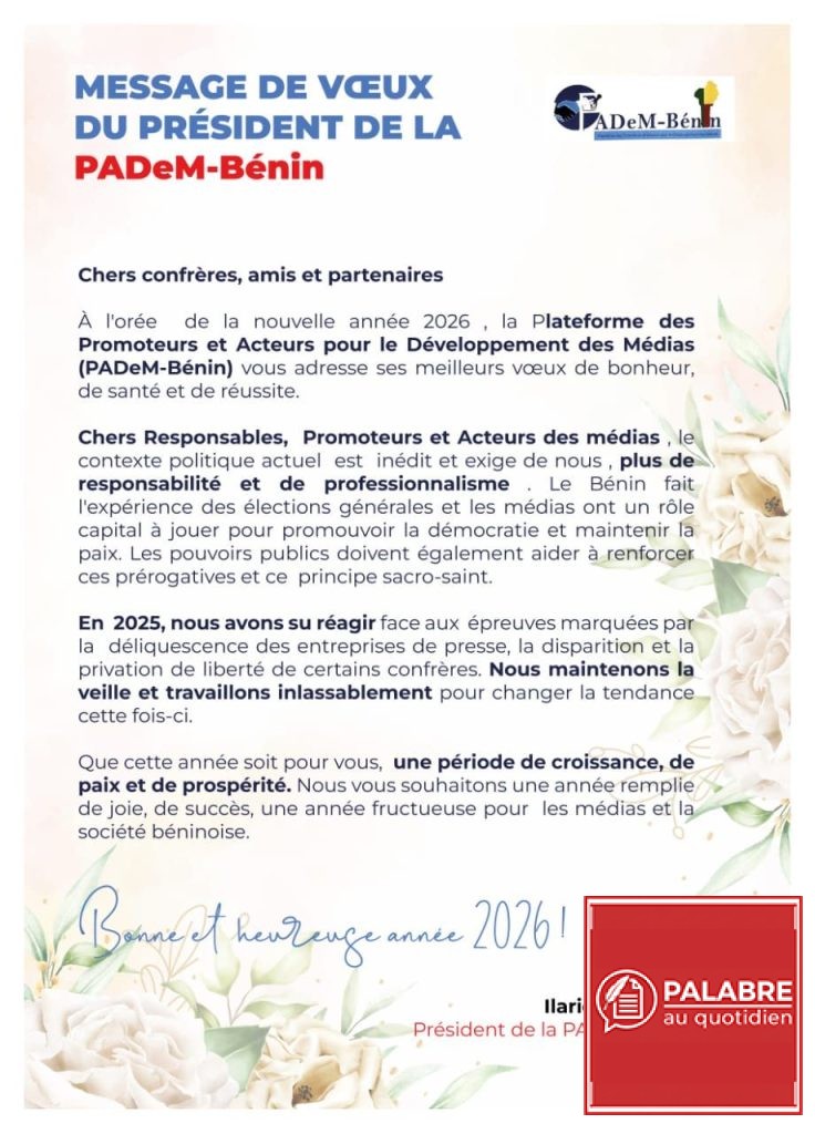 Le président Ilarion Kingnon a formulé des vœux de santé, de succès et de professionnalisme à l’ensemble des promoteurs et acteurs des médias, tout en réaffirmant l’engagement de la PADeM-Bénin à œuvrer pour le développement d’une presse forte, libre et responsable au service de la démocratie béninoise.